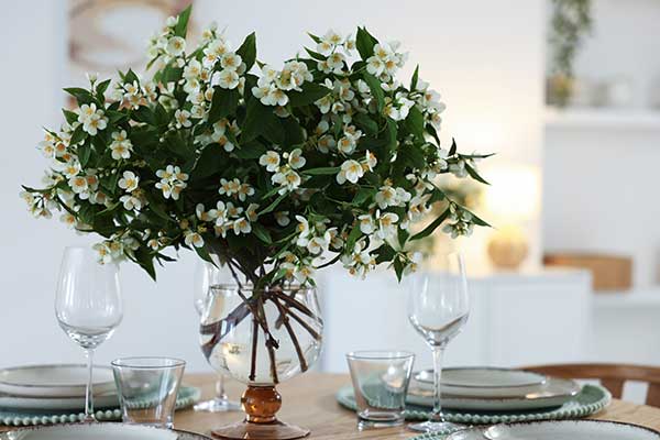 The palette tends to echo the season: pale creams, sun-washed yellows, muted greens. Fresh herbs or small bowls of limes often replace traditional floral arrangements. A cluster of jasmine in a ceramic bowl, or sprigs of tulsi in small glasses, adds fragrance without fuss.