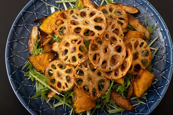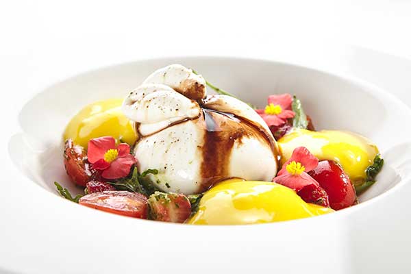 From there, the table often moves to small, seasonal plates designed for grazing and conversation. Tender cucumbers tossed with roasted peanuts and lime, heirloom tomatoes with fresh burrata and basil grown on the balcony, or delicate lotus stem chips dusted with chaat masala offer a balance of textures. Even familiar dishes are interpreted with restraint: a mango and burrata salad, perhaps, or slices of grilled zucchini finished with cold-pressed olive oil and toasted sesame.