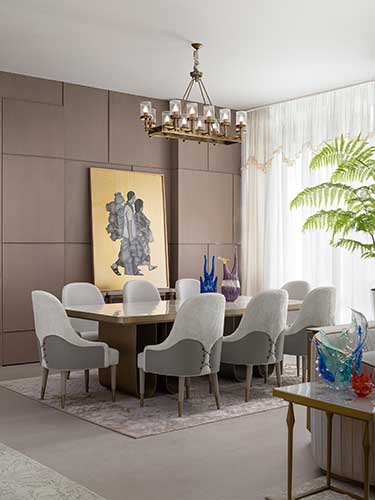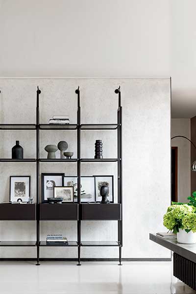 Stylish planters in ceramic, brass, or terrazzo will help add elegance as will wall-mounted or hanging planters in macramé holders near windows. Plant grouping for a curated green corner, or bonsais and succulents on tables and shelves help to create a subtle, soft effect.