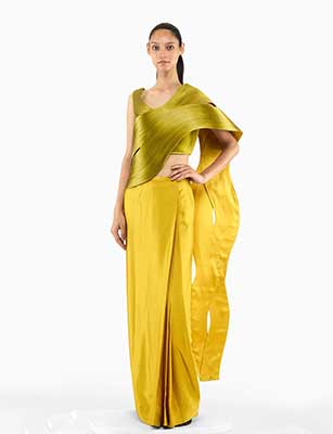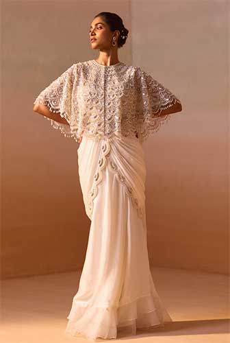 The list of saris innovations is, of course, aplenty. Tarun Tahiliani works metallics, chiffon, and corseted bodices into saris that move like gowns. Gaurav Gupta goes sci-fi with shimmer jersey, organza ruffles, and sweeping capes. Anamika Khanna nails the East-meets-West vibe with asymmetrical cape blouses, dhoti-style drapes, and embroidered jackets instead of the usual blouse. And if you prefer sleek minimalism, Payal Khandwala offers colour-blocked silk saris with clean, pleat-free lines cinched by tailored belts and Masaba Gupta offers fuss-free silhouettes with pre-stitched saris and attached pallus.