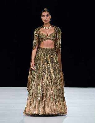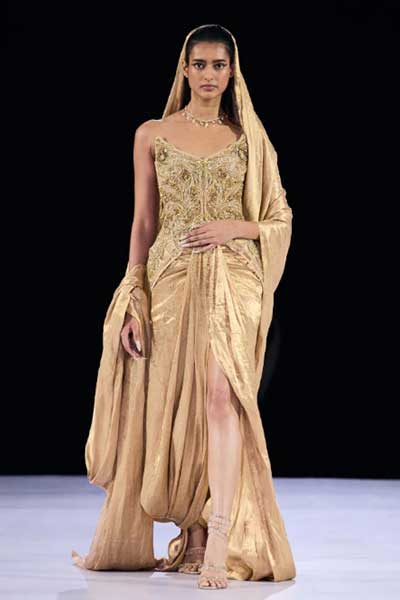 Festive evenings are demanding a touch of light, and designers are obliging with every imaginable metallic—rose-gold tissue saris, pewter silk, and copper-threaded brocades. Gaurav Gupta’s futuristic drapes in gunmetal grey and midnight silver practically glow under candlelight. For those who prefer a whisper rather than a shout, Raw Mango offers handwoven Banarasi saris with just a glint of silver zari—enough to catch the eye without stealing the entire spotlight. Or even Nikita Gujral’s scallop nalki zircon embroidered cape.