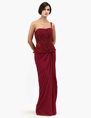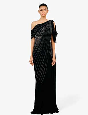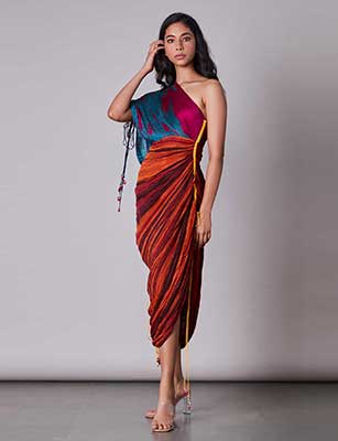 Then, if you love movement, look for pre-stitched saris with cascading trails or asymmetrical hems. Delhi duo Shivan & Narresh do jersey drapes with thigh-high slits and capes that double as dupattas—ideal when you want to glide from party to after-party without a single safety pin.