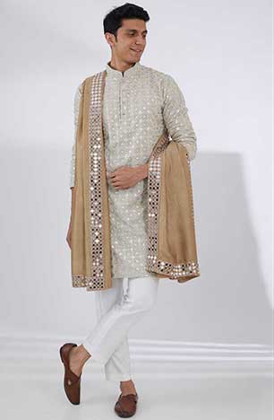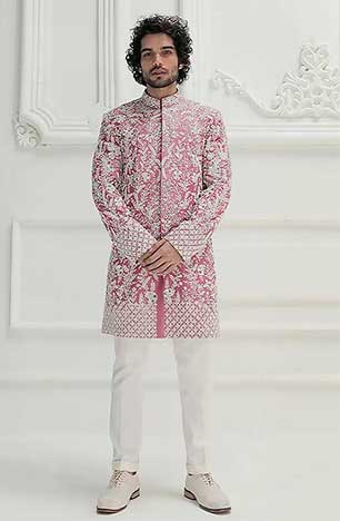 Manish Malhotra’s velvet sherwanis in jewel tones like emerald, deep burgundy, sapphire finished with antique gold embroidery also stand out. Pair them with slim churidars or even cropped trousers for a contemporary silhouette. And don’t overlook the layered look: designers like Raghavendra Rathore are styling sherwanis over bandis (waistcoats) and longline shirts for depth and texture.