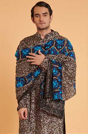 What makes these new-age pieces exciting is how they balance heritage with a global, street-smart sensibility. Embroideries like chikankari, gota patti, and Kashmiri aari remain central, but they’re being reimagined. Picture a black silk sherwani with traditional Kashmiri motifs rendered in metallic cobalt thread, or a sari edged in mirror work but cut to reveal an asymmetrical leg slit.