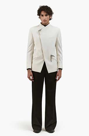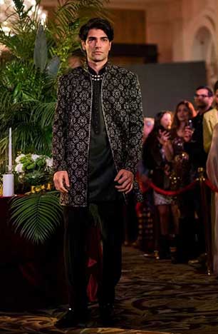 Men’s festive wear this season is just as adventurous. The sherwani—once a straight, knee-length coat—is now flirting with unexpected shapes. Kunal Rawal leads the charge with asymmetrical hemlines and overlapping closures that feel almost Japanese. His tone-on-tone metallic thread-work adds a subtle shimmer that photographs beautifully under party lights.