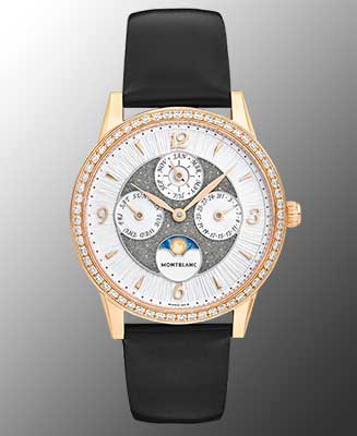 Montblanc has unveiled the 36mm Bohème Perpetual Calendar, crafted in Le Locle and Villeret, blending traditional horology with modern artistry. Available in solid rose gold or bi-metal construction, the case houses the Calibre MB 29.15, a perpetual calendar movement accurate until 2100 with a 42-hour power reserve. The dial features four elegantly arranged sub-dials floating over a sparkling micro-diamond field, evoking a night sky. A stamped filé d’étoiles outer ring adds celestial depth, while a watercolour-inspired moon phase at 6 o’clock enriches the design. Sixty brilliant-cut diamonds encircle the bezel, doubling as a minute track. Legible floral numerals, rose gold-coated leaf hands, and handwriting-style indicators add refinement. Three interchangeable calfskin straps complete this highly technical yet feminine masterpiece.
